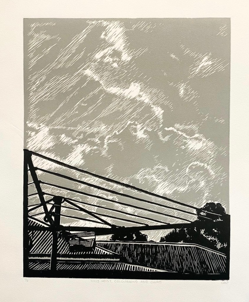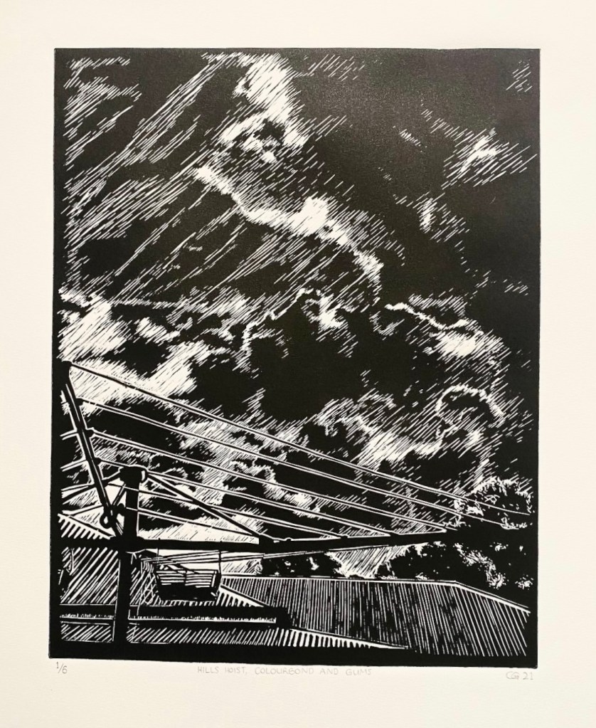 Hills Hoist, Colourbond and Gums reflects the nostalgic Australian domestic narrative. Inspired by a photo I took in my own backyard; I wanted this artwork to feel familiar for audiences and evoke memories of the quintessential Australian lifestyle. I also included my obsession with clouds and the awe-inspiring presence they have over our lives.