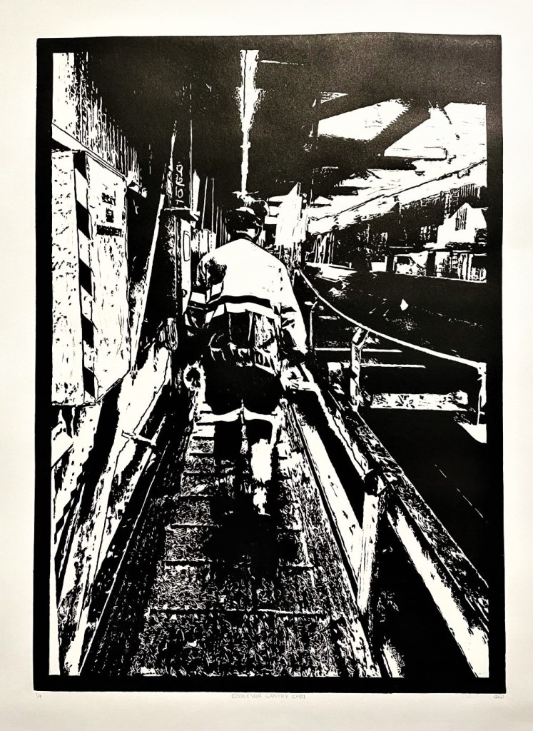 One of my Dad’s jobs as an electrician at Springvale coal mine is to check that the coal belts are running smoothly, and this is him doing just that. The coal mine setting is rich in visual opportunities and inspiration for me. The dynamic and elaborate machinery and workers all sprinkled in coal dust and mud are something to be celebrated in our industrial community.