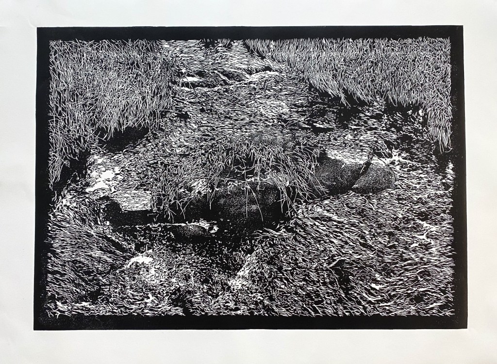 Rocky Waterhole on the Cox’s River near Lake Wallace’s dam wall is a special place to me and my family. It is a place we frequently see on walks with our two dogs, and we love to see the natural changes in water level, grass colour and watching the wildlife. I wanted this artwork to encapsulate the movement of the stream and evoke the sounds, smells and feeling of being in a place such as this.